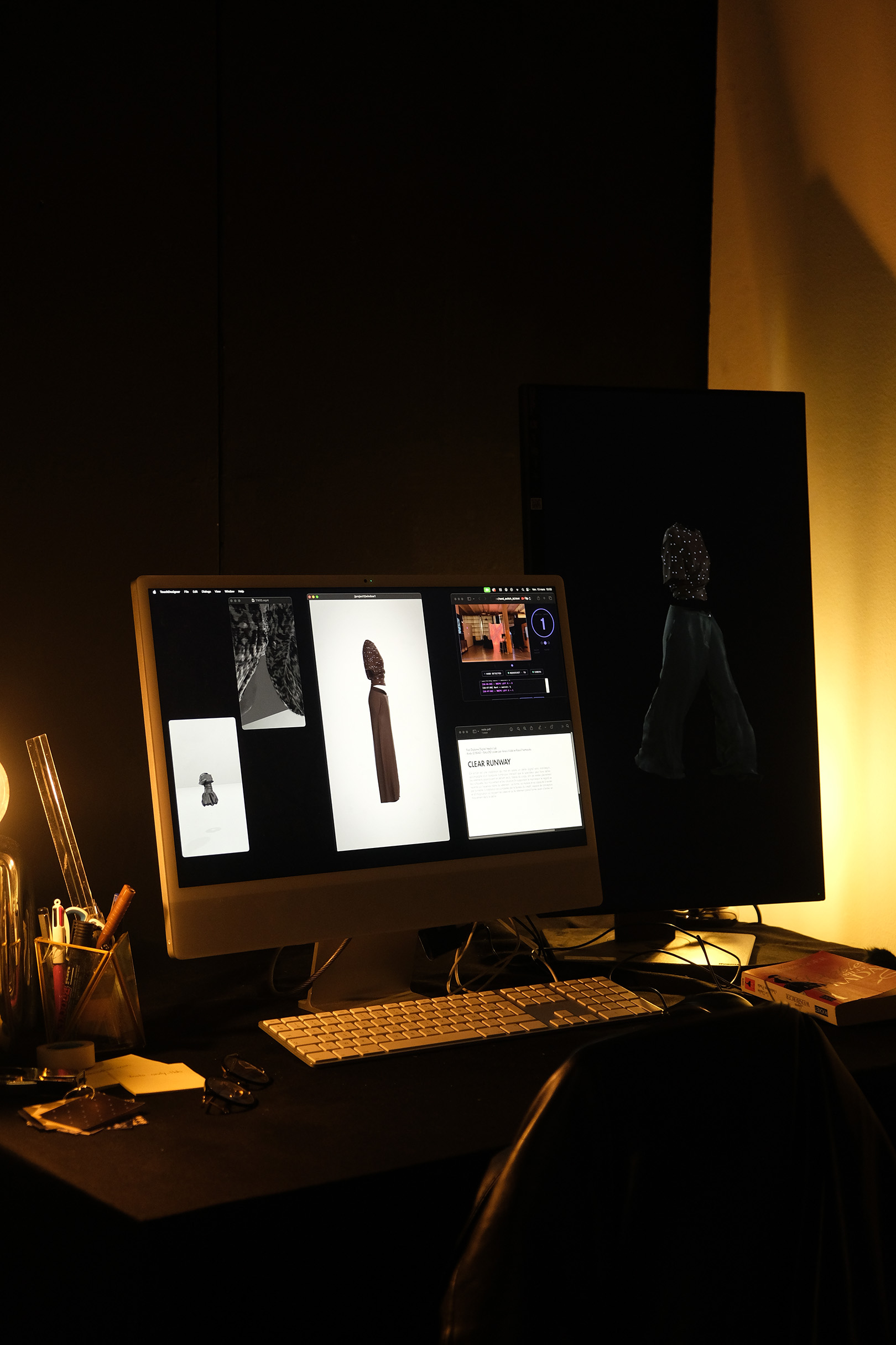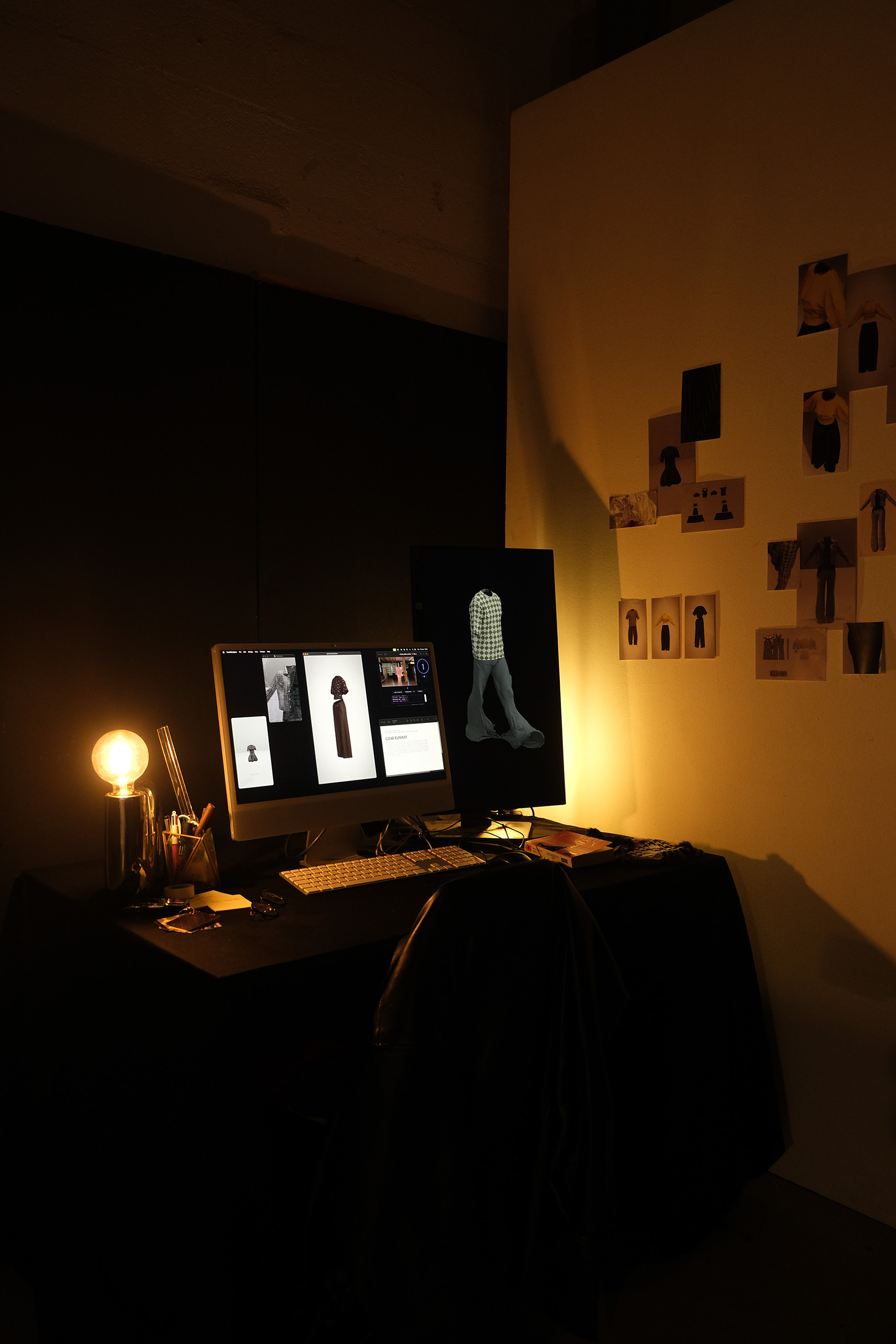 L'installation est complétée par le bureau du créatif, espace de conception et d'imagination où naissent les idées et où le vêtement prend forme avant d'entrer en mouvement dans le défilé.